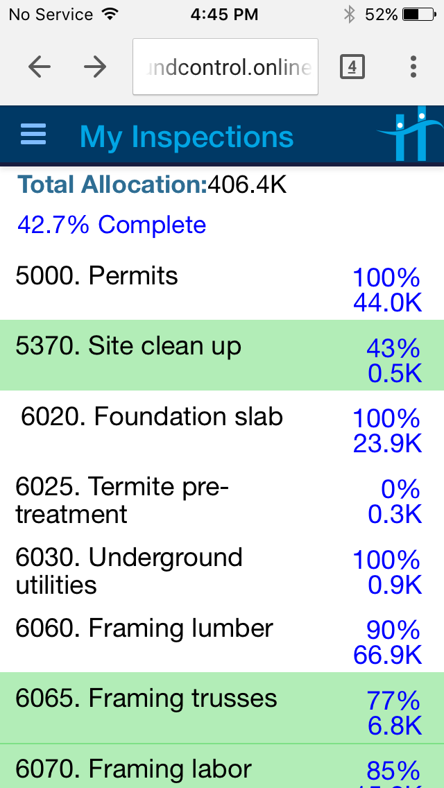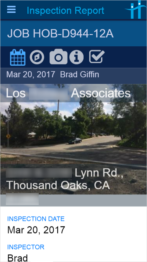 Scheduled jobs are routed to inspectors, who use a mobile phone or tablet to photograph and report the status of building line items, site conditions, and project progress.
